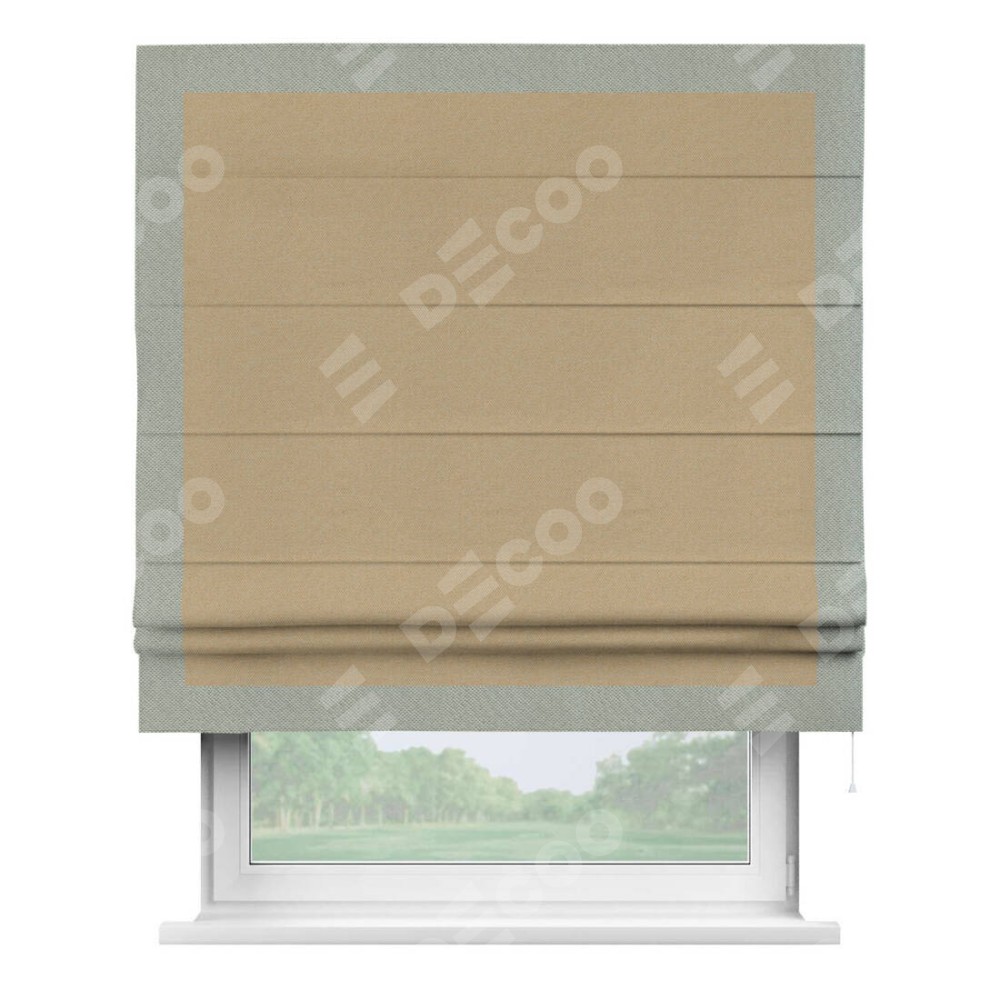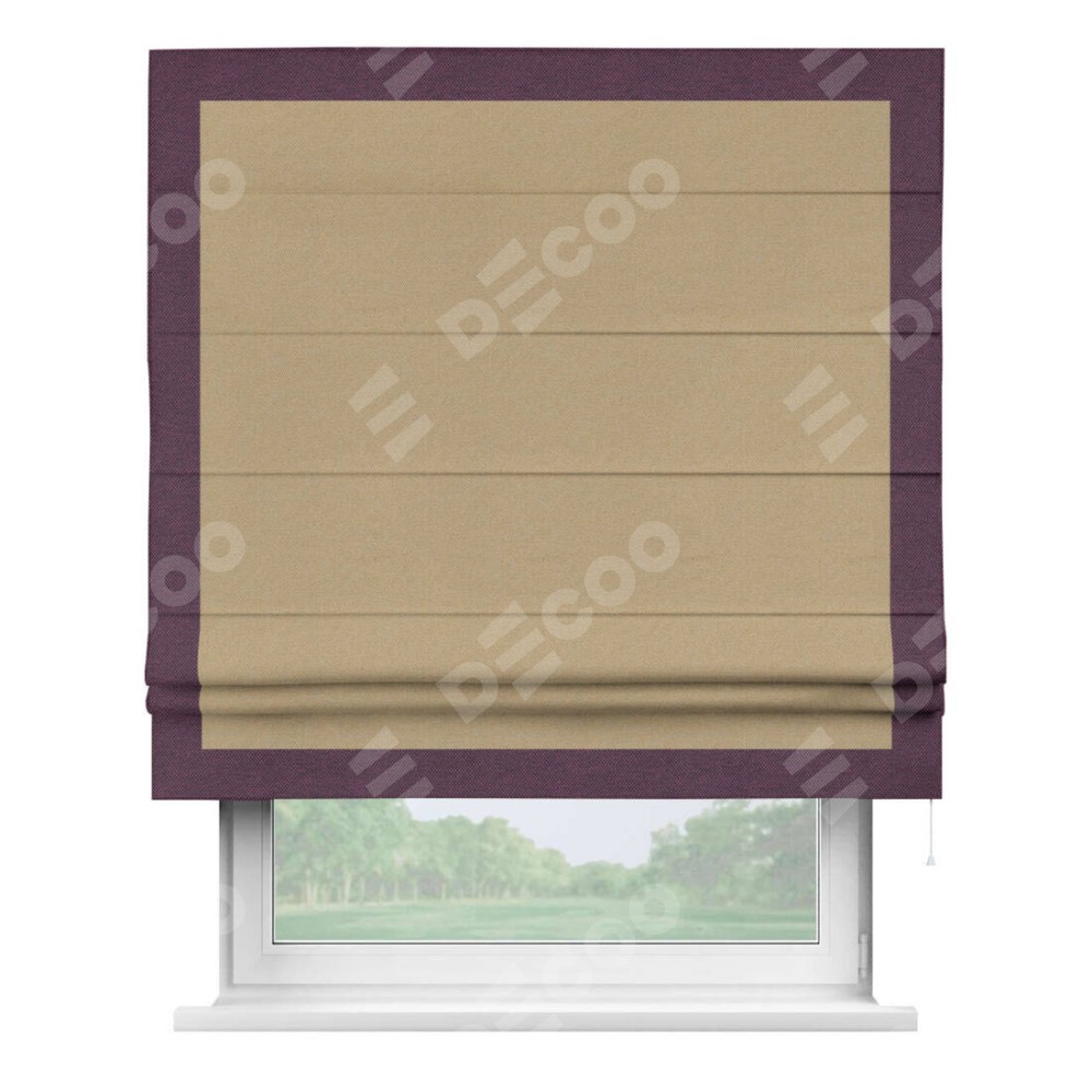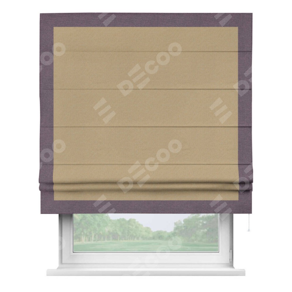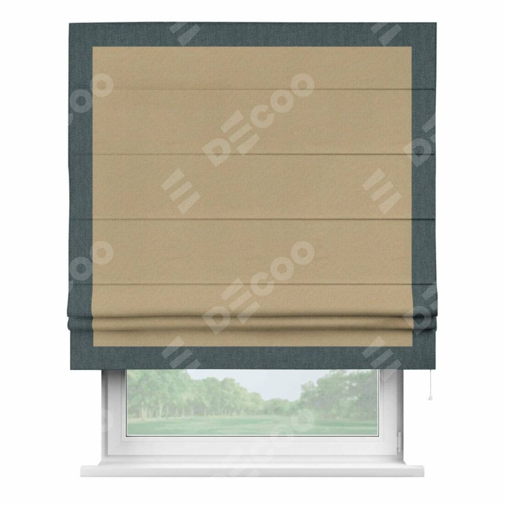 Римская штора производителя «Cortin», используется для проёма, пошита из ткани лён димаут тёмно-бежевый, артикул 83037. Отделка шторы кантом «Чесс», ткань для канта используется из льна димаут разной расцветки на выбор. Имеет универсальный механизм и подходит для монтажа: на потолок, на стену и в нишу.