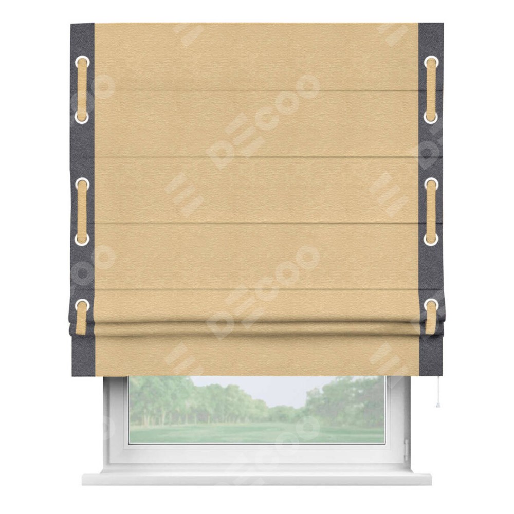 Римская штора производителя «Cortin», используется для проёма, пошита из ткани софт однотонный бежевый, артикул 4202 05. Отделка шторы кантом «Стрим Дуо» на кантах расположены люверсы с пояском, ткань для канта используется из софта разной расцветки на выбор. Ткань для пояска обычно используется из основной ткани шторы, а так же можно сделать из любой расцветки по желанию. Имеет универсальный механизм и подходит для монтажа: на потолок, на стену и в нишу.