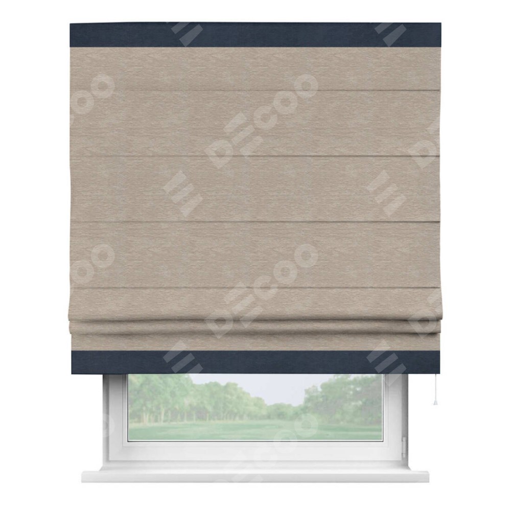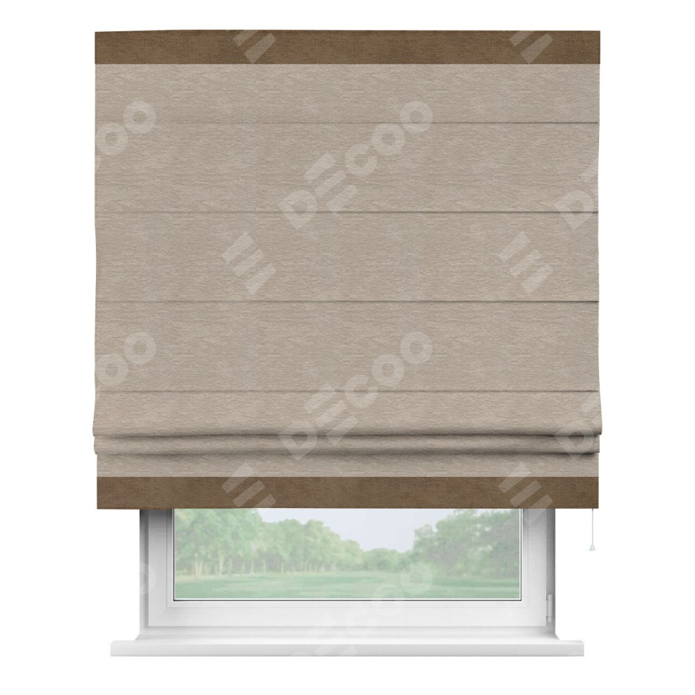Римская штора производителя «Cortin», используется для проёма, пошита из ткани софт однотонный темно-бежевый, артикул 1640. Отделка шторы кантом «Горизонт», ткань для канта используется из софта разной расцветки на выбор. Имеет универсальный механизм и подходит для монтажа: на потолок, на стену и в нишу.