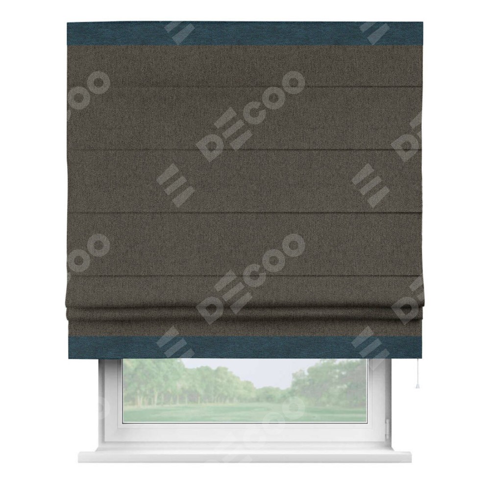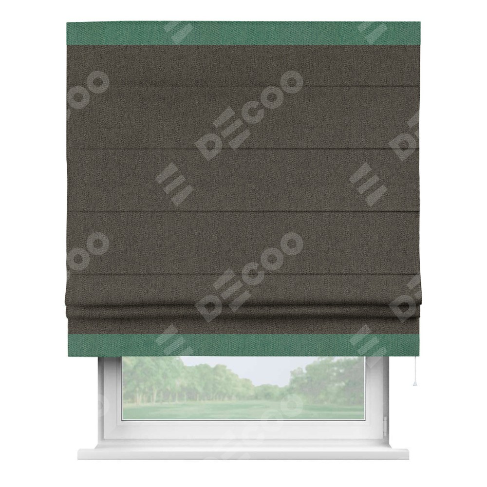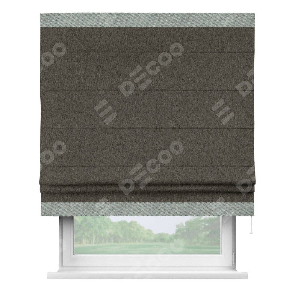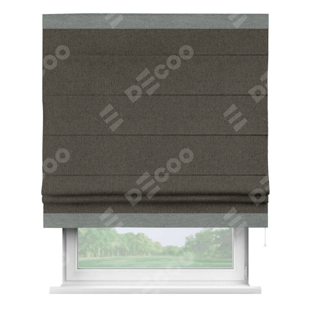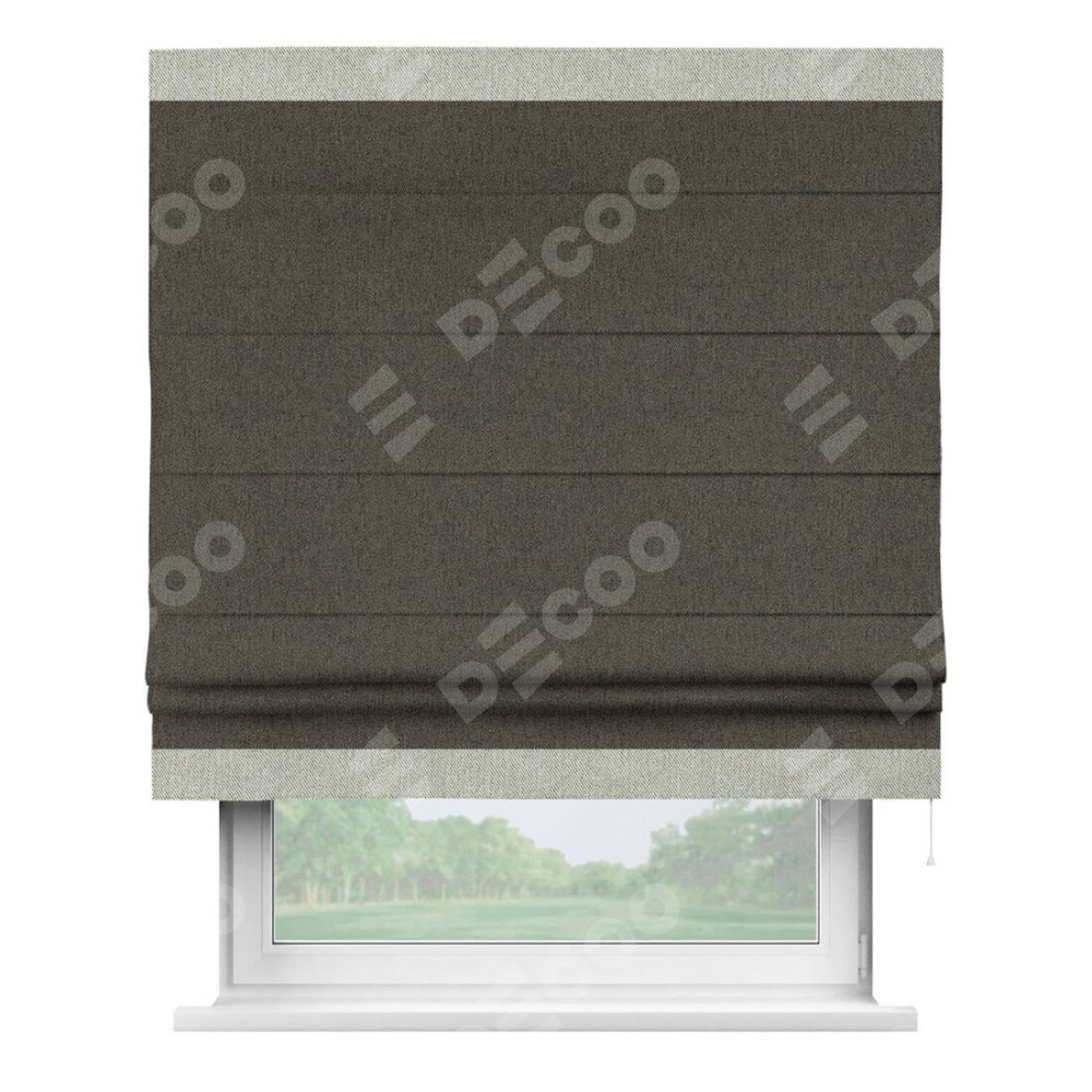 Римская штора производителя «Cortin», используется для проёма, пошита из ткани твид блэкаут тёмно-коричневый, артикул 21584. Отделка шторы кантом «Горизонт», ткань для канта используется из твида разной расцветки на выбор. Имеет универсальный механизм и подходит для монтажа: на потолок, на стену и в нишу.