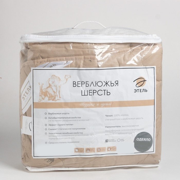 Утеплитель: верблюжья шерсть 50%, лебяжий пух (высокоизвитое полиэфирное силиконизированное волокно) 50%, плотность наполнителя 300 г/м².