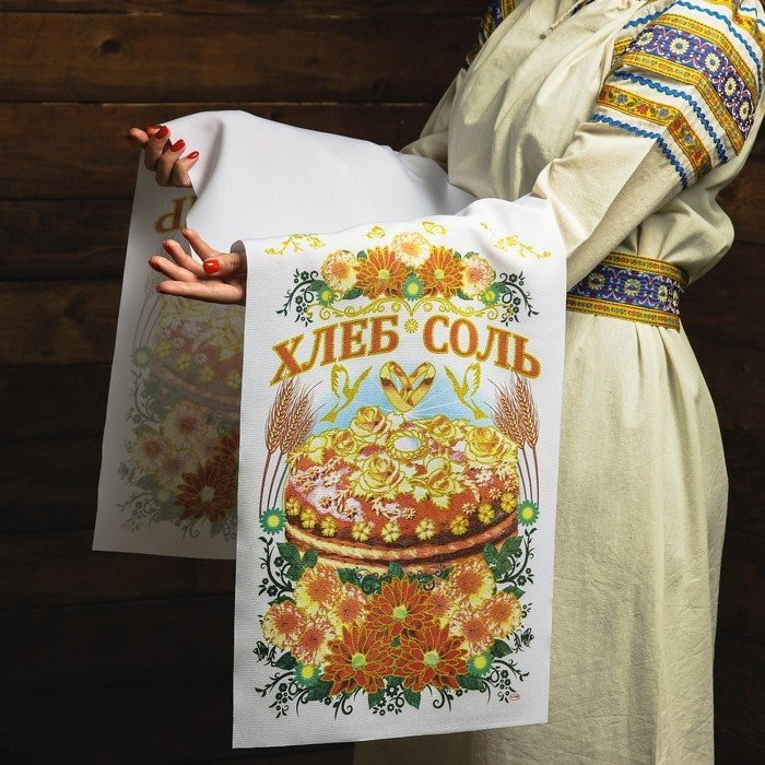 Рушник под ноги. Кто первым из молодых на него встанет — тому и быть хозяином в доме. Лучше отказаться от вариантов, на которых изображена пара голубей или лебедей, а также кольца. Считается, что супруги могут затоптать своё счастье. Лучше отдать предпочтение геометрическим или растительным узорам.