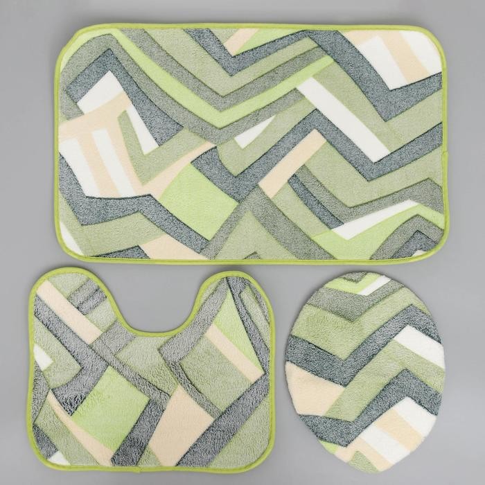 Набор ковриков для ванны и туалета Доляна «Геометрия», 3 шт: 35×39, 40×50, 50×80 см, цвет зелёный