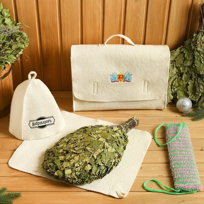 Для комфортного отдыха в парной возьмите с собой набор банных принадлежностей. Предметы из этого комплекта предохраняют тело от перегрева и являются средствами индивидуального пользования. Влажные изделия рекомендуется сушить в расправленном виде на горизонтальной поверхности. Принадлежности из войлока и фетра стирайте вручную при температуре воды 30 °C.