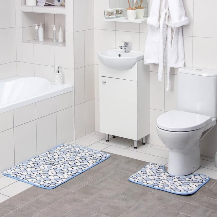 Набор ковриков для ванны и туалета Доляна «Галька», 2 шт: 40×50, 50×80 см, цвет синий